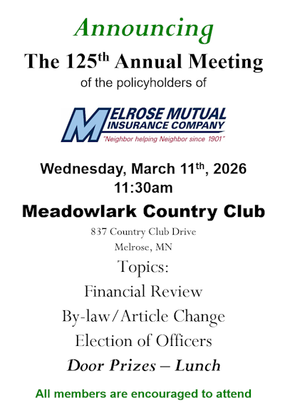 As a township mutual insurance company, our structure is different than other insurance companies. We package some coverages with a larger company and we operate under Minnesota Statute Chapter 67A. Melrose Mutual writes the fire and extended coverages for the property. The wind, liability and inland marine portion of the coverages are packaged with North Star Mutual. Together, Melrose Mutual and our packaging partners offer a complete farm or home package in one policy with many options to tailor coverage to your needs. Our independent agency force can offer you most any other insurance protection you desire such as auto, business or umbrella coverages.